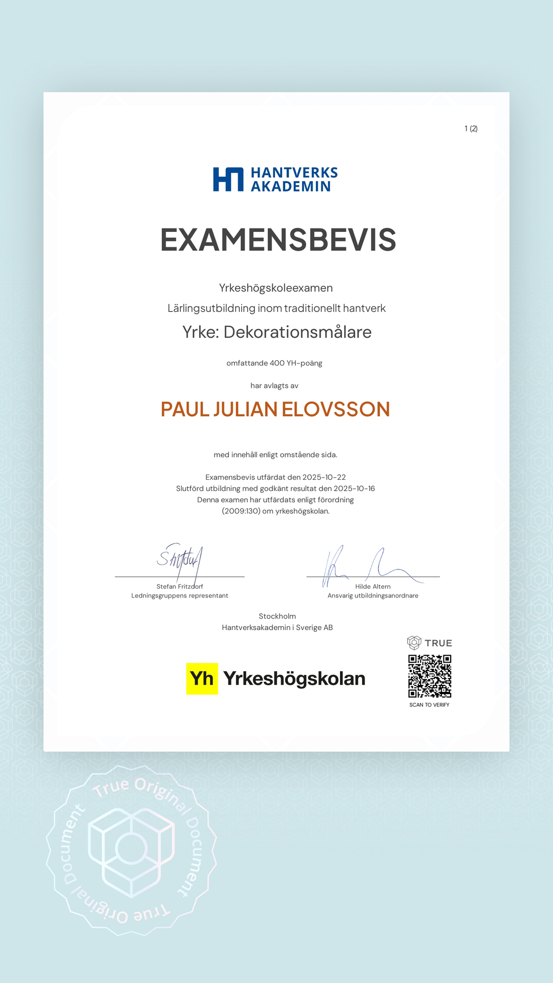 Alla TRUE -document är säkrade med blockchain-teknologi och kan verifieras som äkta. Klicka på verifieringsknappen bredvid dokumentet eller skanna QR-koden med din smartphones kamera. Ingen app krävs - dokumentets äkthet verifieras omedelbart.
